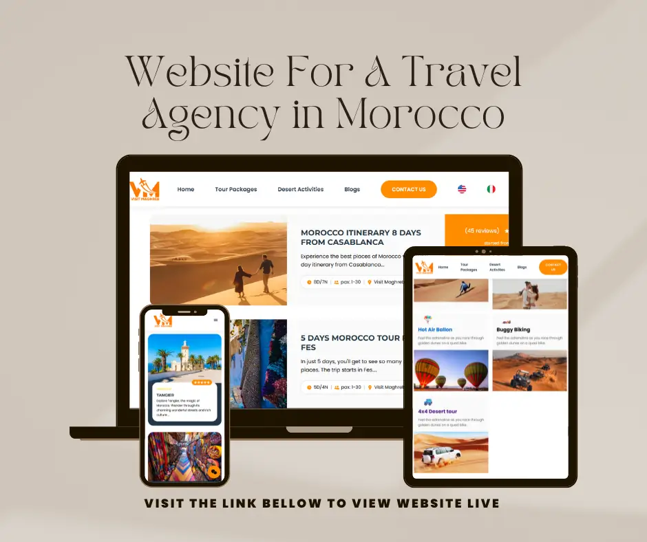 I offer professional logo design, website creation, social media content design, social media management, video editing, SEO analysis, and custom tour organizing across Morocco.